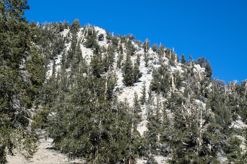 As you can see, these trees, which approach ages of over 5,000 years, grow in areas between 5,600 and 11,00 feet. These are on a hill at just over 10,000 feet in the White Mountain region of California.