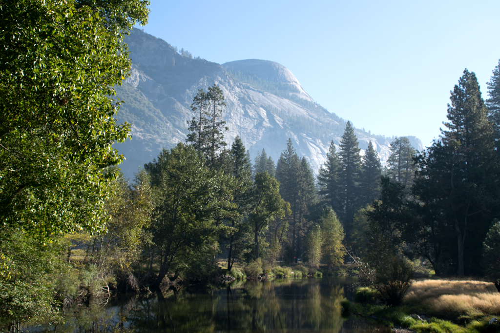This is a shot of Half Dome from Olmsted Point (named for Frederick Law Olmsted). If you look carefully, you can see smoke in the valley to the left of the dome, and rising behind it to the right.
